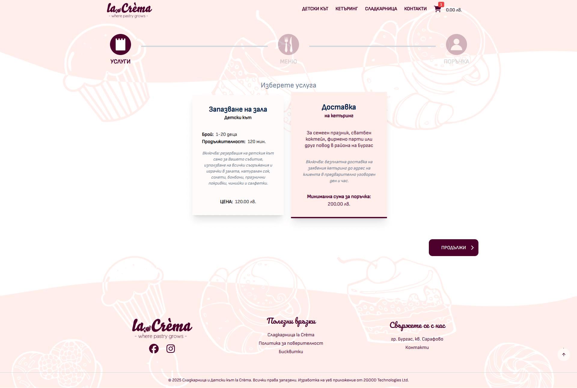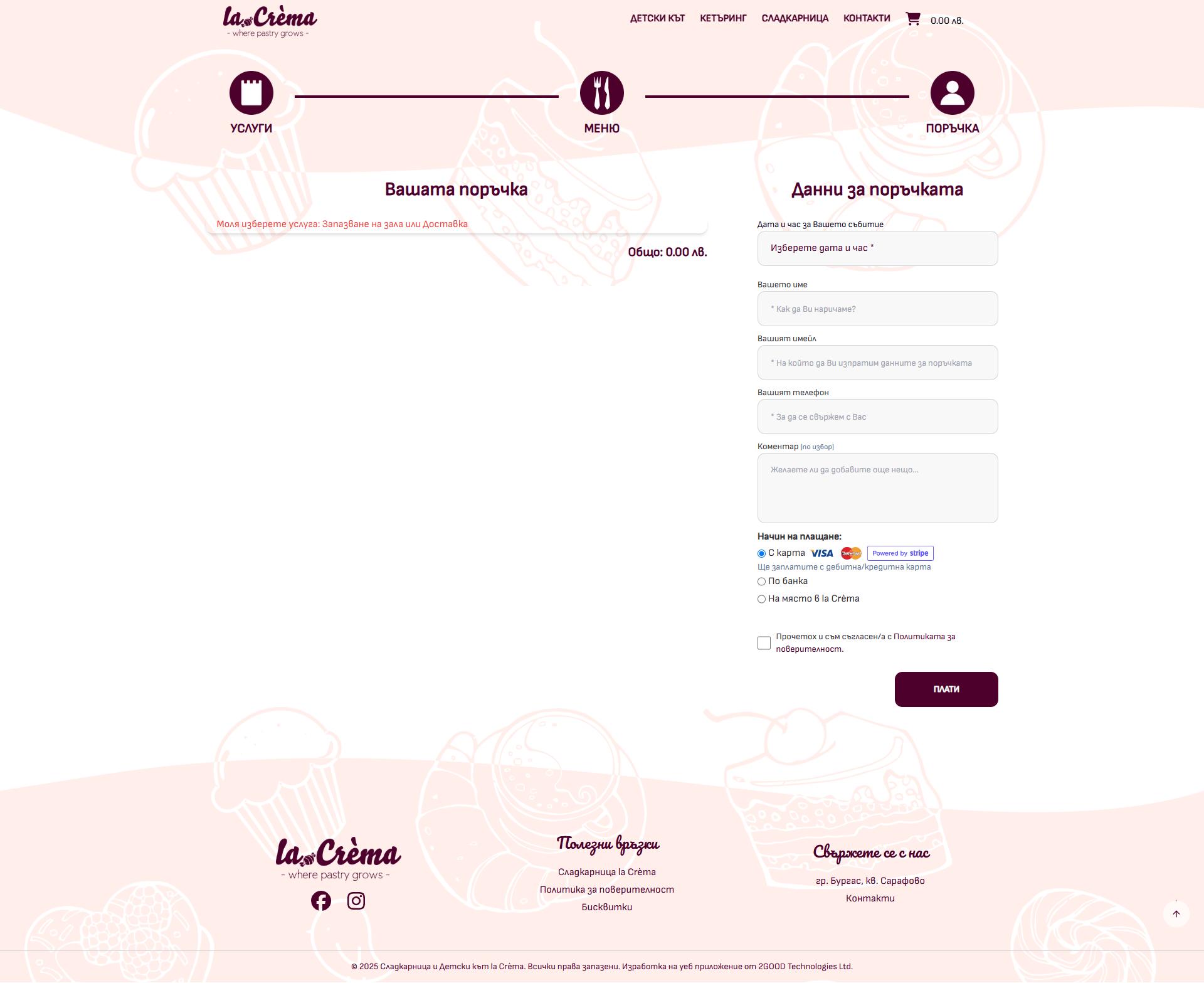 Кетъринг и Детски кът la Crèma Бургас предлага комплексни услуги, включително резервация на Детски кът за семейно тържество, организиране на събития за деца, доставка на кетъринг до заведението или друг адрес в рамките на града. За осъществяване на тези комплексни услуги, la Crèma имаше нужда от надеждна платформа, която да позволява извършване на онлайн резервация на детския кът и/или доставка на кетъринг продукти.